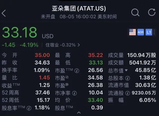 目前,亚朵的股价已经较当初11美元的发行价上涨2倍,对应33.18美元/股,市值45.85亿美元。