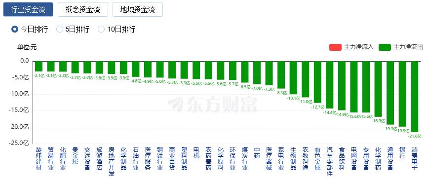 净流出方面,消费电子、银行、通用设备等净流出排名靠前,其中消费电子净流出21.55亿元。