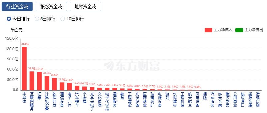 行业资金方面,截至收盘,半导体、互联网服务、证券等净流入排名靠前,其中半导体净流入126.60亿。