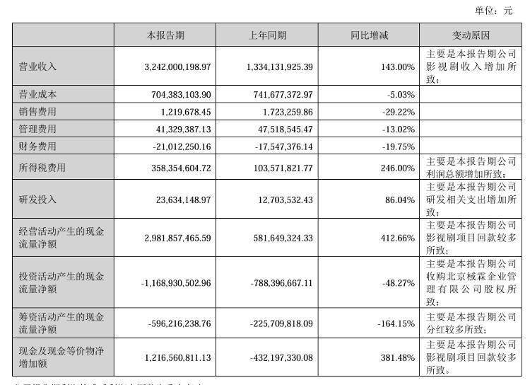 8月26日晚间,北京光线传媒股份有限公司(光线传媒,300251.SZ)发布2025年半年度报告,上半年公司实现营业收入32.42亿元,同比增长143%;归属于上市公司股东的净利润为22.29亿元,同比增长371.55%。公司计划不派发现金红利,不送红股,不以公积金转增股本。对于营收增长,半年报解释称,主要是本报告期公司影视剧收入增加所致。